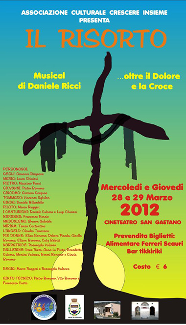 L'Associazione "Crescere Insieme" invita al musical "IL RISORTO", che si terrà nei locali del cineteatro a Scauri alle ore 21,00 di giovedì 28 e venerdì 29 marzo 2012. Alla fine della manifestazione, sarà sponsorizzata la vendita delle uova AIL (Associazione Italiana Leucemie), quest'anno dedicata all'accoglienza gratuita per familiari e pazienti nelle Case AIL. In particolare, con riferimento alla nostra isola, il contributo sarà diretto a "LA COCCINELLA", Casa AIL di Palermo.